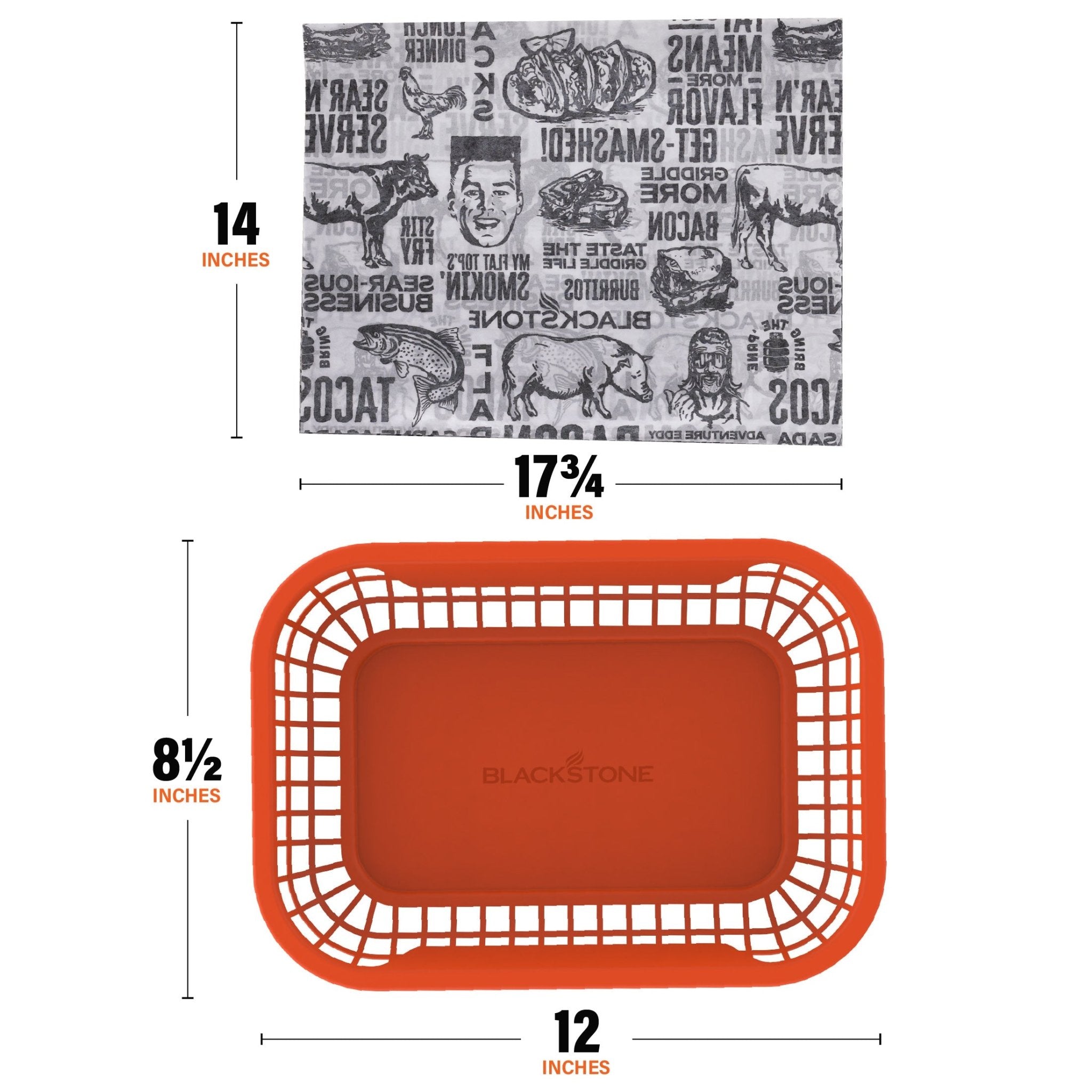Turn your backyard into your own diner with the Blackstone Burger Baskets with Basket Liners. The multipurpose baskets can be used to serve up burgers and fries. sandwiches. breakfast dishes. and anything else you can think of! Cover the basket with the disposable liner and once the meal is done. throw away the liner and place the basket in the dishwasher for effortless cleanup. Make your breakfast. lunch. and dinner a unique experience with the Burger Baskets with Basket Liners.