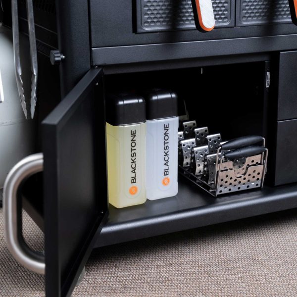 • Dual side shelves. paper towel holder. garbage bag holder. pass through side shelf cutting board.