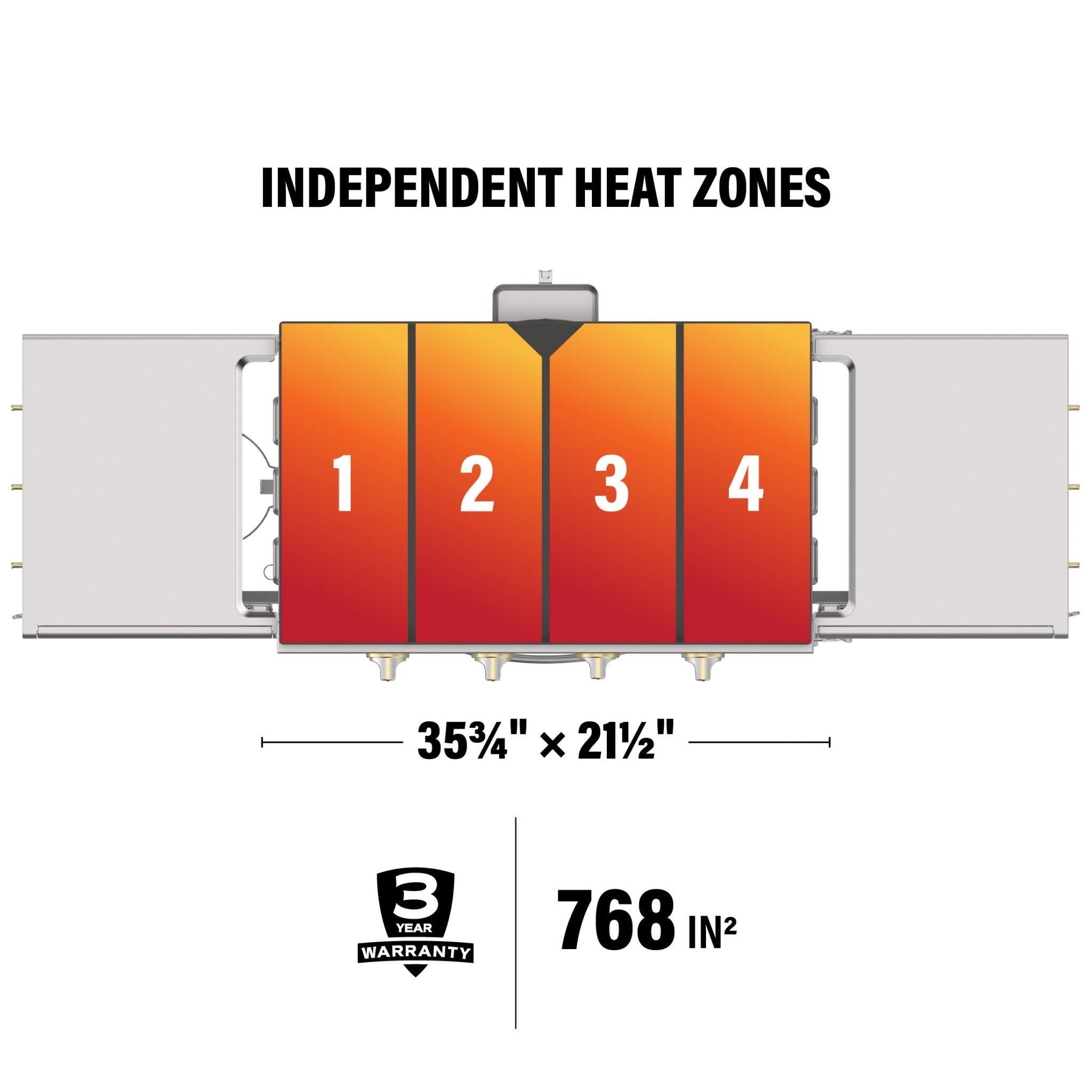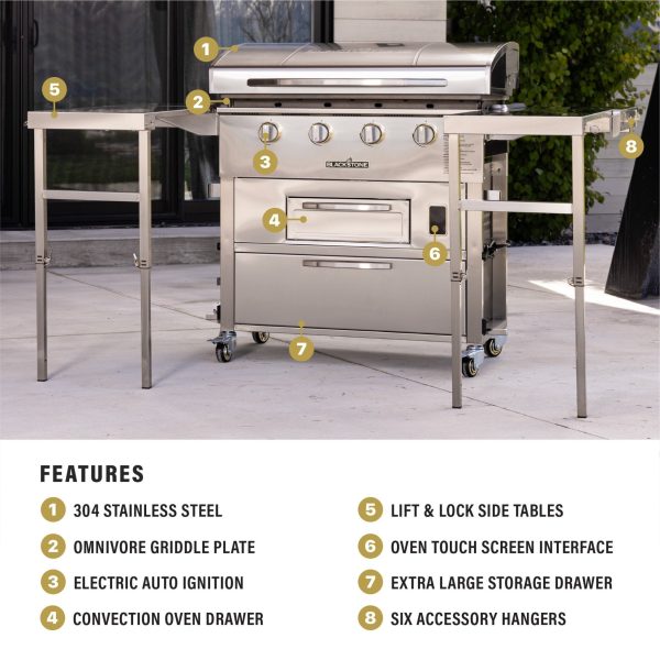 Embrace a new era of cooking convenience and excellence. The Blackstone Select 36” Griddle with Convection Oven is a fusion of thoughtful design and culinary power. From the high-efficiency Omnivore griddle plate to the high-powered convection oven you’ll have the power to create family favorites at every meal. The versatility of the convection oven is complemented by the intuitive touchscreen interface. giving you precise control over the 500-degree Fahrenheit range of heat. Equipped with dual extendable side tables -designed to lift and lock into place- that provide a generous 1500 sq inches of space for food preparation. Transform your outdoor kitchen into a culinary haven with the Blackstone Select 36” Griddle with Convection Oven.